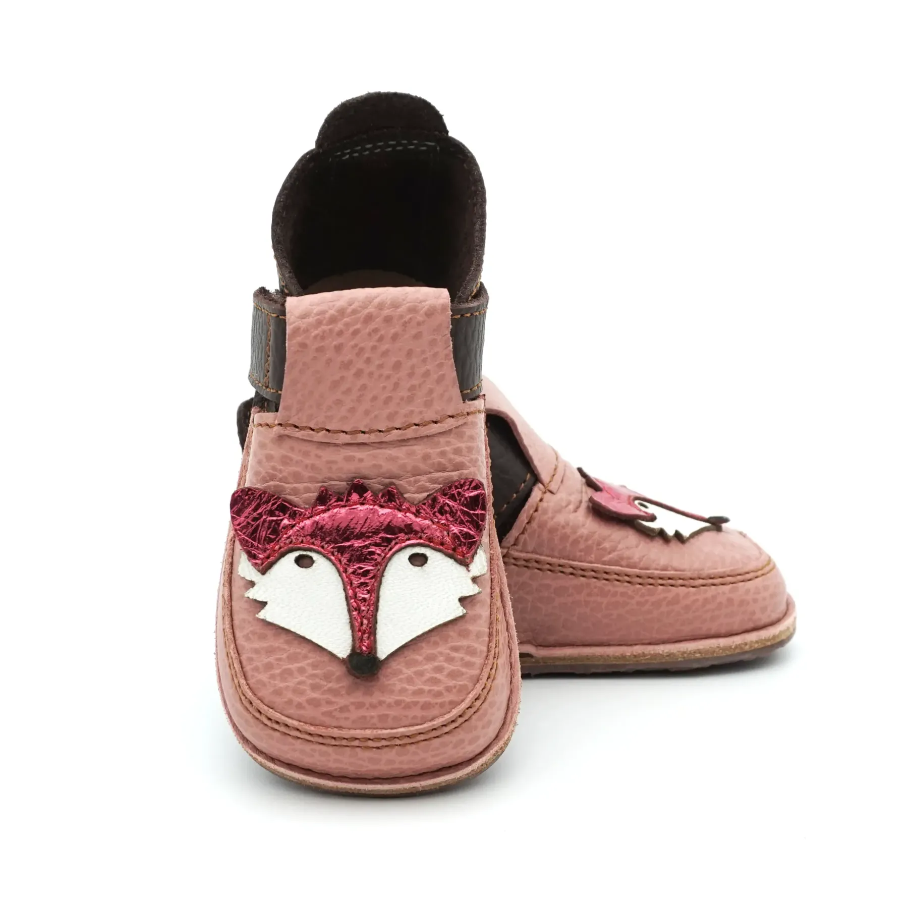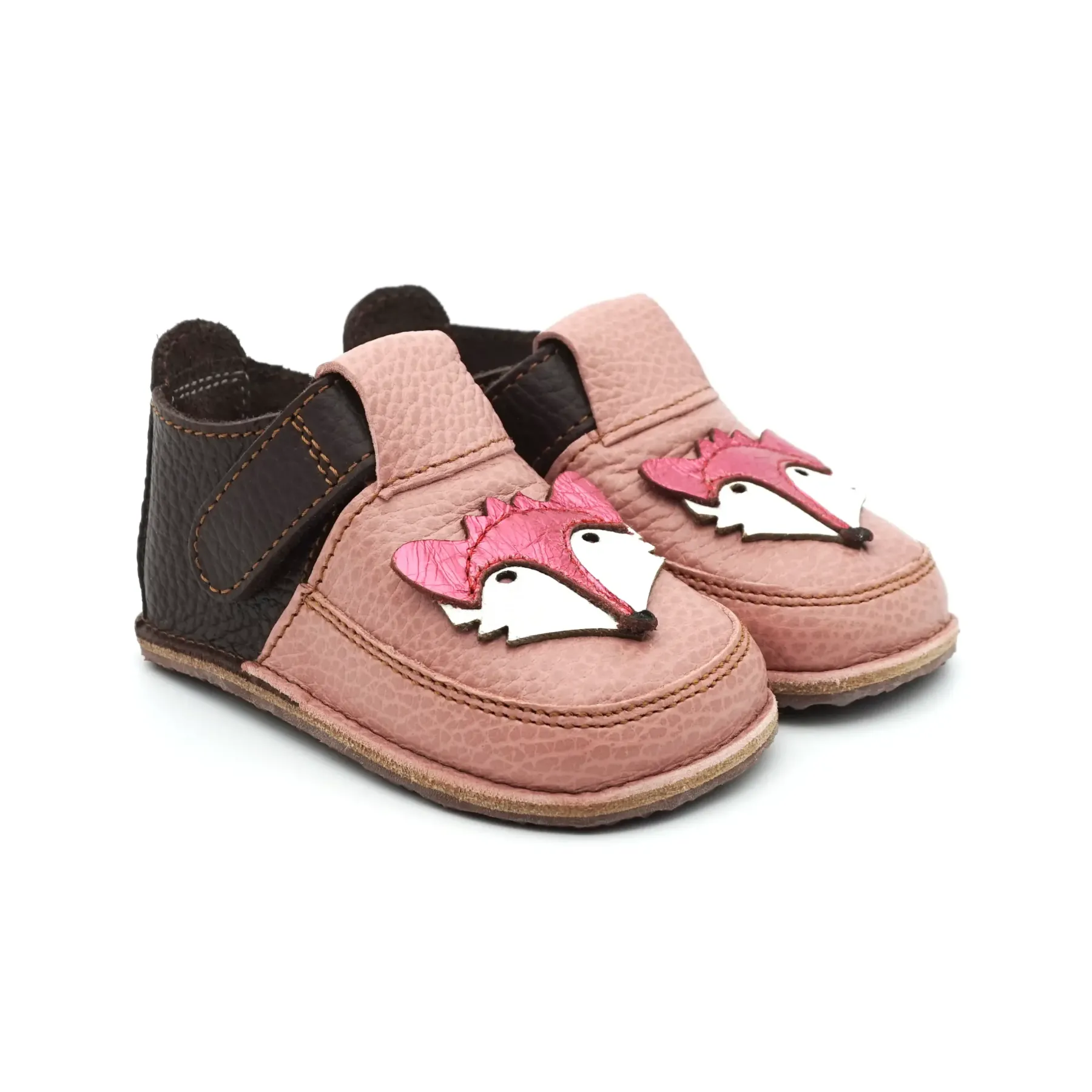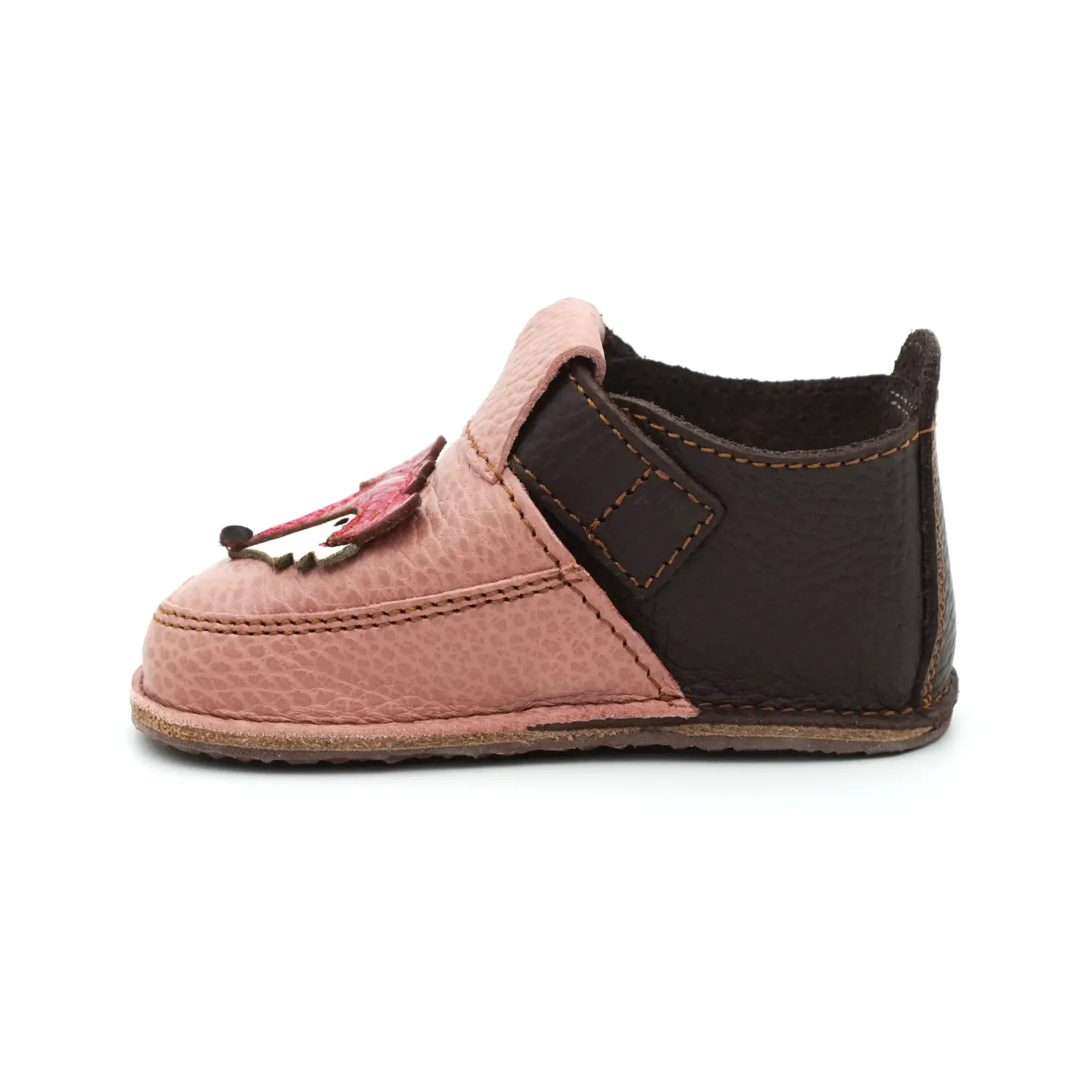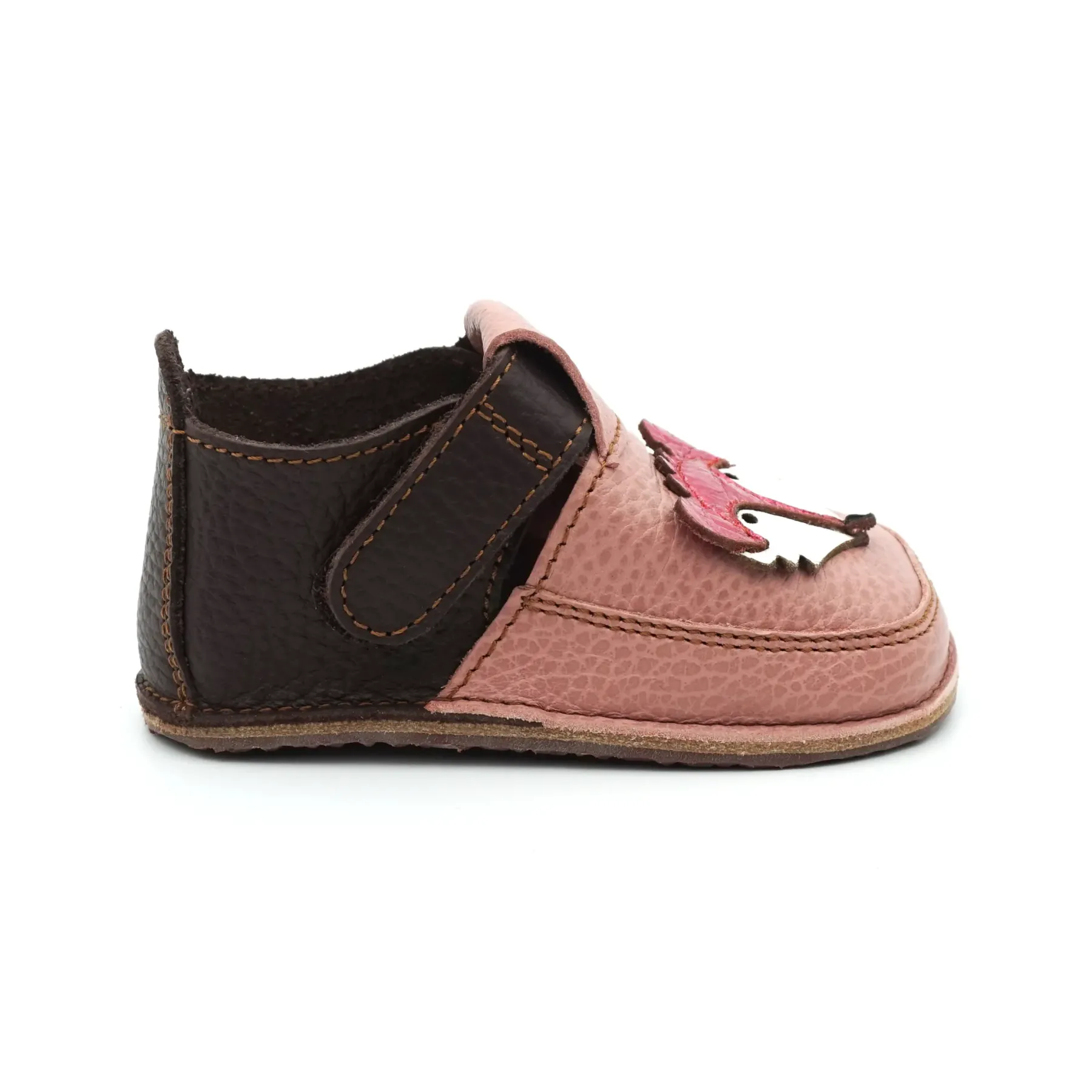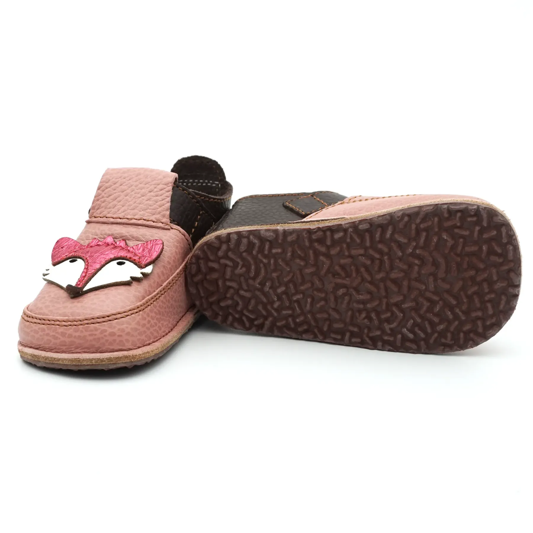 Acesti papucei primii pasi barefoot cu un design jucaus, prietenos si vesel, sunt confectionati in Romania, din piele naturala de cea mai buna calitate provenita din Italia. Talpicul este din piele tabacita vegetal, iar talpa este din cauciuc ultraflexibil si antiderapant, caracteristici pe care trebuie sa le indeplineasca orice pantof primii pasi. Pielea este atat de moale, talpa atat de flexibila si cutia pentru degetele este atat de incapatoare, incat acesti papucei primii pasi bifeaza toate caracteristicile unor pantofi primii pasi barefoot pentru bebelusi.